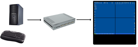 The Datapath VQS-01 is a display wall controller which connects to the VGA output of any PC and displays the image across 4 displays. Each display shows 1/4 of the VGA image in a 2 x 2 format.