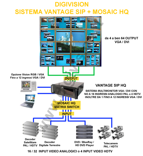 Il sistema Vantage SIP con l'opzione MOSAIC HQ ha ben 16 ingressi video analogici (sono possibili fino a 32 ingressi) oppure 4 ingressi YUV HD che possono essere posizionati su uno o più dei monitor collegati, da 1 fino a ben 64, ed inoltre con l'opzione Vision RGB si possono avere in overlay anche segnali provenienti da PC (da 1 fino a un massimo di 12) con uscita VGA / DVI mantenendone la risoluzione originale. Nella sua massima configurazione si può espandere da un minimo di 2 monitor in alta risoluzione della configurazione base fino ad un masimo di 64 monitor con più overlay video per ciascun display.